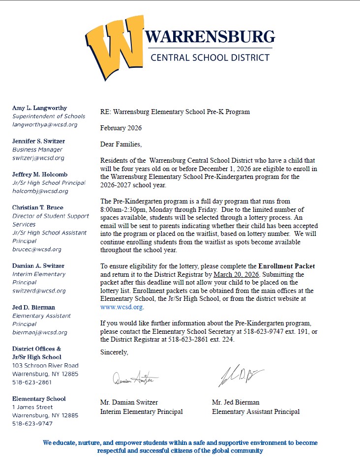 Our Pupil Personnel Services and Counseling Services provide guidance and extra help for students. Warrensburg CSD offers full-day pre-kindergarten and kindergarten to eligible students. Learn more about enrolling students here.